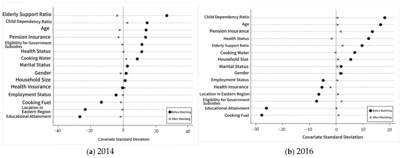 На рисунке 2 представлены характеристики выборки до и после PSM. До сопоставления наблюдались значительные различия между ковариатами. Однако после сопоставления по методу ближайшего соседа 1:4 эти различия существенно сократились, а стандартные отклонения для многих факторов приблизились к нулю. Анализ после сопоставления показывает, что в среднем бедные группы демонстрируют более низкие уровни притязаний и поведенческих способностей примерно на 10,6% и 10,05% соответственно по сравнению с небедными группами. Это соответствует предельному эффекту около −0,5 по 5-балльной шкале для уровней уверенности и способностей, указывая на то, что бедные люди, как правило, получают на пол-уровня ниже по этим показателям при контроле других переменных. Эти результаты убедительно свидетельствуют о значительном негативном влиянии материальной бедности на психологическую бедность, демонстрируя, что статус бедности связан с примерно 10% более низкими уровнями притязаний (уверенности) и способностей (межличностных навыков) среди бедных групп по сравнению с их небедными сверстниками.