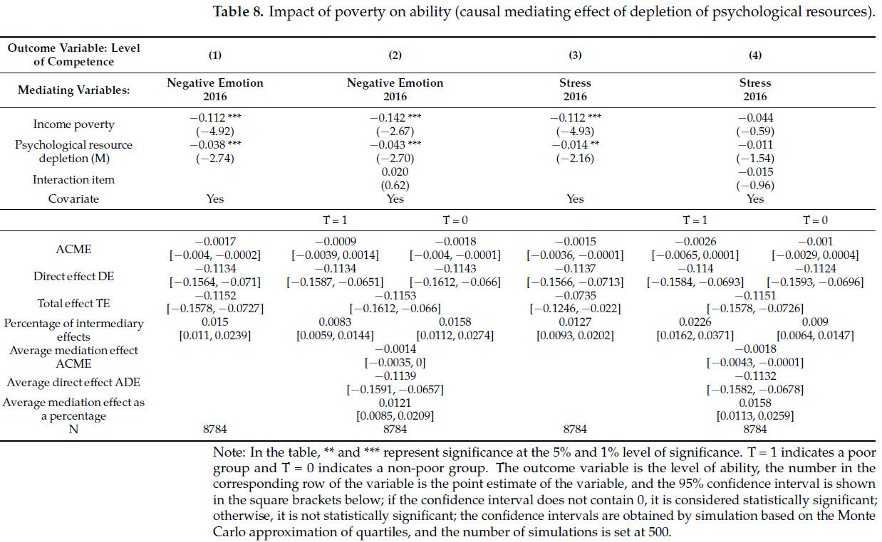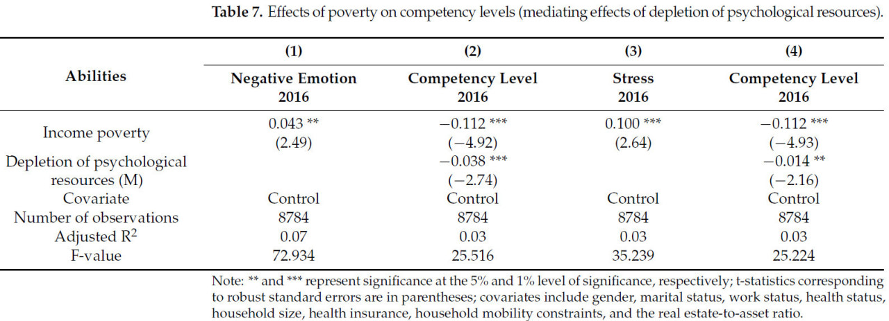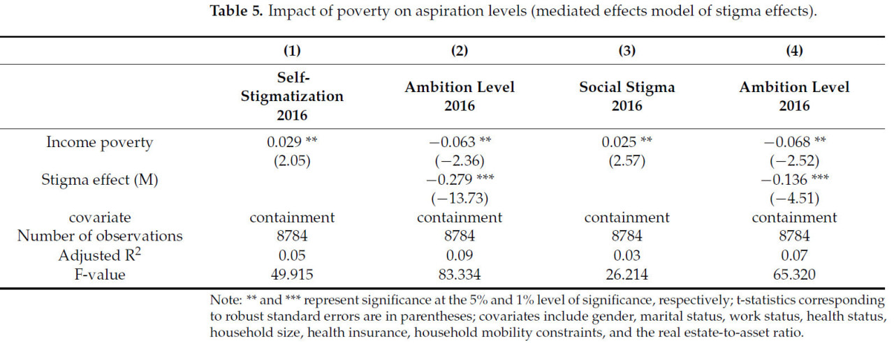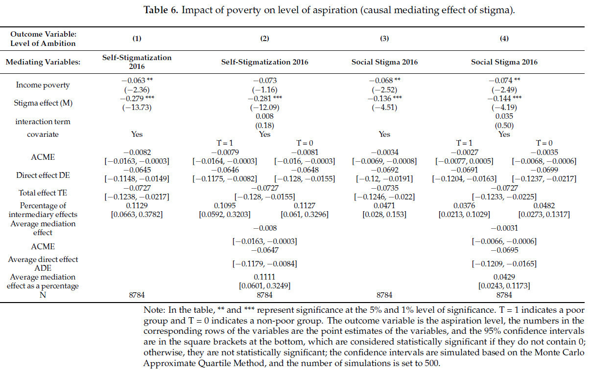 Как обычные линейные модели, так и модели причинно-следственного опосредованного эффекта, с учетом или без учета взаимодействия между независимыми и опосредованными переменными, последовательно демонстрируют, что бедность по уровню доходов значительно снижает уровень индивидуальных стремлений посредством опосредованных эффектов самостигматизации и социальной стигматизации при контроле других ковариатов.