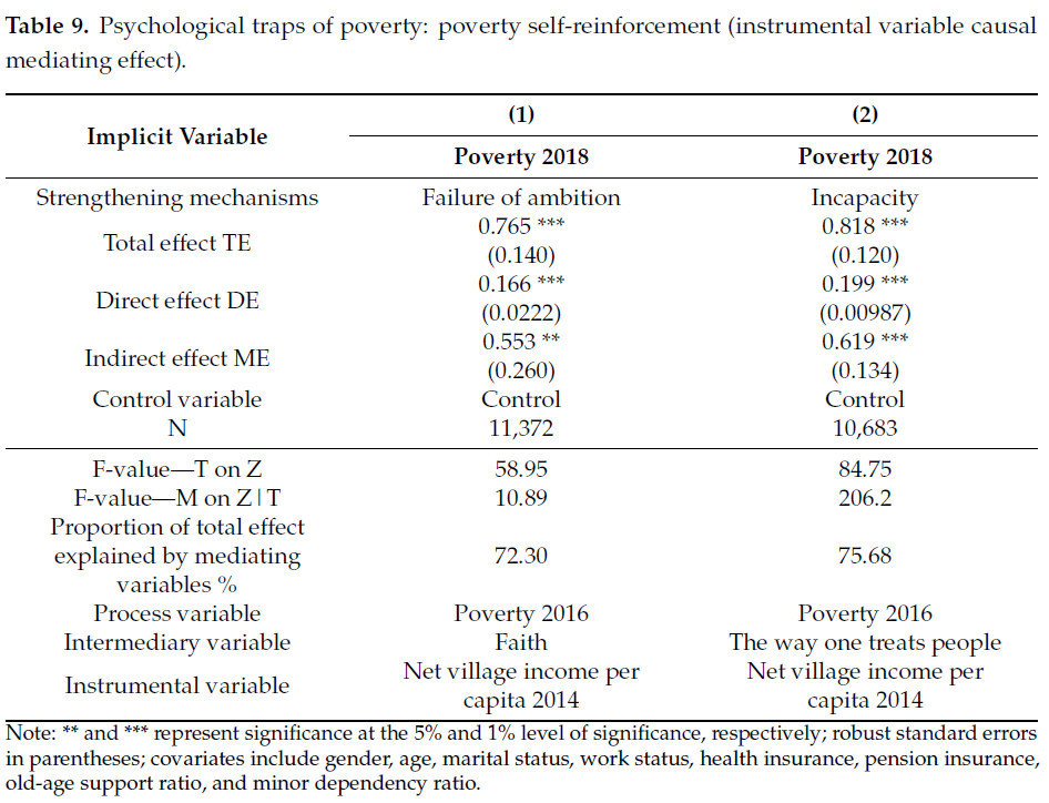 В третьей части анализа, посвященной изучению эффекта психологической ловушки бедности, уровни стремлений и возможностей используются в качестве основных независимых переменных, а бедность — в качестве зависимой переменной. Для устранения потенциальной эндогенности, обусловленной обратной причинно-следственной связью, в исследовании используется инструментальный подход с использованием переменных в рамках модели причинно-следственной связи, что позволяет получить эмпирические доказательства самоусиливающегося механизма «психологической ловушки бедности».