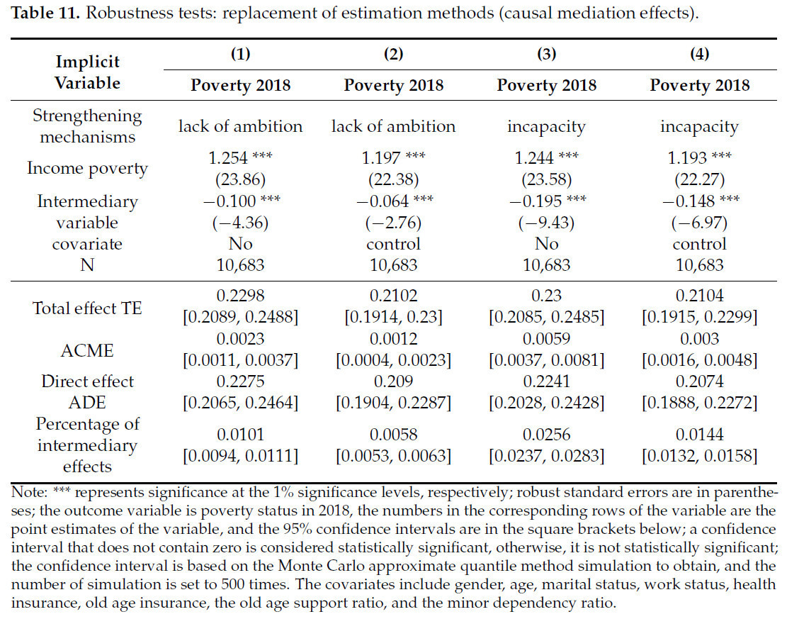 Результаты причинно-следственных опосредованных эффектов регрессий модели CMA показаны в Таблице 6. Модели (1) и (2) показывают, что самостигматизация значительно ухудшает влияние бедности по доходу на уровни доверия между бедностью, основанной на доходе, и уровнями притязаний. Модель (1) не содержит члена взаимодействия для независимых и опосредующих переменных, а 95% доверительный интервал для влияния бедности по доходу на уровни доверия через эффект самостигматизации не содержит нуля, что указывает на существование опосредующего эффекта. В этом случае при контроле других переменных прямой эффект составляет −0,0645, общий эффект составляет −0,0727, а опосредующий эффект составляет 11,29%. Модель (2) добавляет эффект взаимодействия, и опосредующий эффект самостигматизации остается значимым, с долей опосредующего эффекта 11,11%. Аналогично, модели (3) и (4) показывают, что эффект социальной стигмы значительно усиливает влияние бедности по доходу на уровень доверия между бедностью по доходу и уровнем притязаний. Модель (3) не содержит члена взаимодействия для независимых и опосредующих переменных, 95% доверительный интервал для влияния бедности по доходу на уровень доверия через социальную стигму не равен нулю, и опосредующий эффект присутствует. Опосредующий эффект составляет 4,71%. Модель (4) с учетом члена взаимодействия имеет среднюю долю опосредующего эффекта 4,29%.