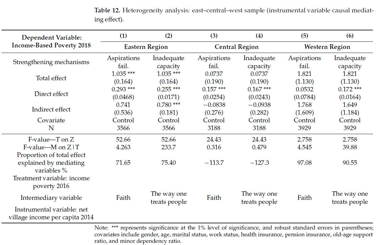 Результаты регрессии для всей выборки свидетельствуют о существовании «психологической ловушки бедности», предполагая, что отсутствие амбиций и недостаток возможностей могут еще больше усугубить ситуацию бедности человека. Но справедливо ли это явление для всех регионов? Или оно различается на разных уровнях экономического развития? Психическое состояние, как микрофактор, также более очевидно подвержено влиянию объективной внешней среды. Например, различия в характере между южанами и северянами также приведут к различиям в психологическом состоянии. Поэтому в данной статье выборка разделена в соответствии с традиционными тремя основными регионами: восток, центр и запад, чтобы дополнительно выявить характеристики психологической ловушки бедности в различных регионах. Для обеспечения сопоставимости результатов регрессии метод регрессии и зависимая переменная те же, что и в Части III, используется инструментальный переменный причинно-следственный анализ IV-CMA, а результаты оценки представлены в Таблице 12 .