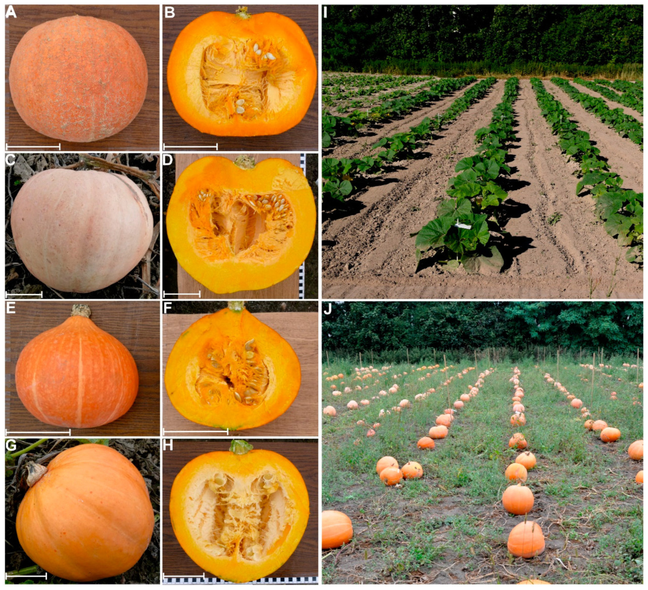 Рисунок 1. Фотографии целых плодов и поперечных срезов плодов четырех испытанных сортов: (A,B) — Bambino; (C,D) — Otylia F1; (E,F) — Justynka F1; (G,H) — Mammoth Gold. (I,J) Вид эксперимента (2022): (I) — растения примерно через четыре недели после высадки; (J) — собранные спелые плоды, разложенные для оценки и отбора образцов. Масштабные линейки: 10 см.
