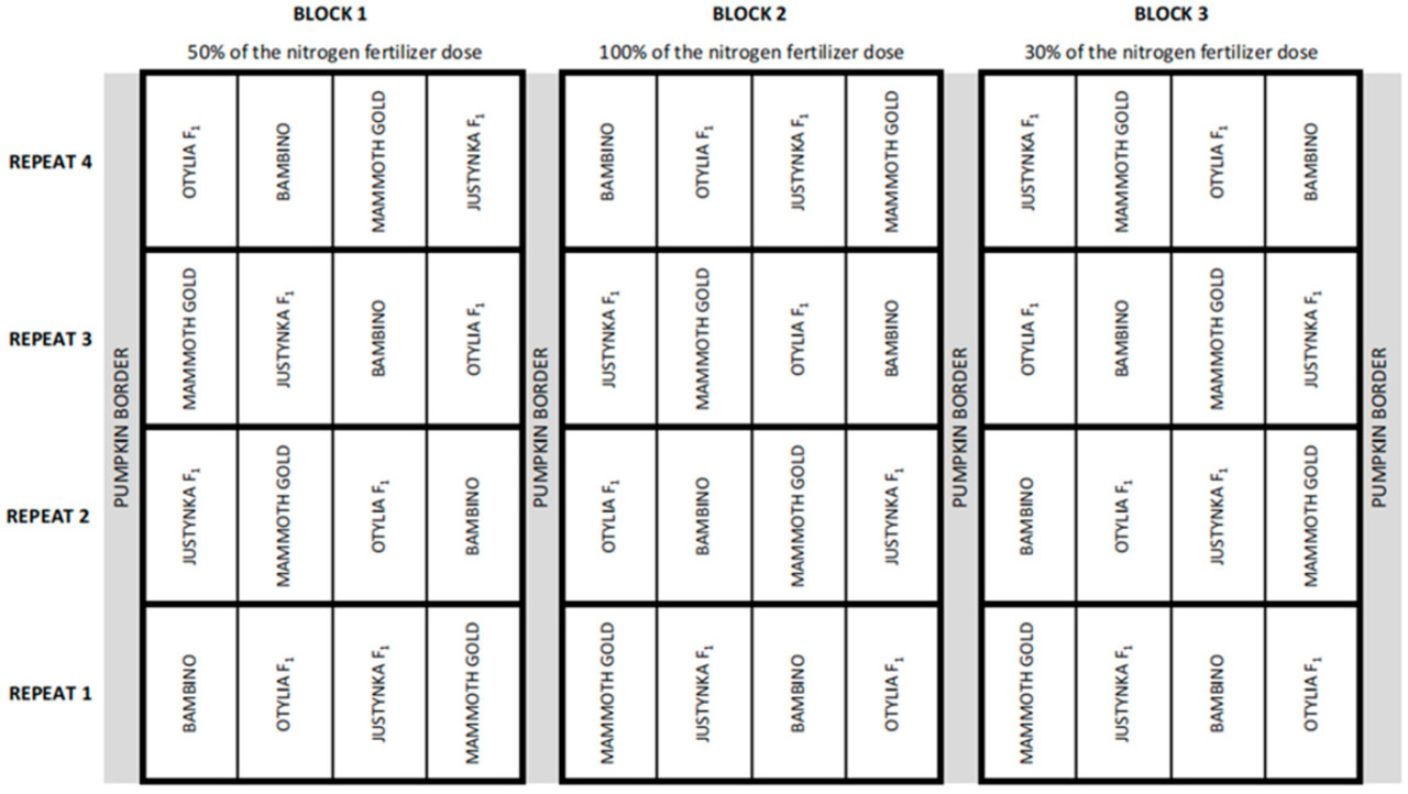 Эксперименты были заложены с использованием метода расщепленных делянок с тремя блоками и четырьмя повторениями по 24 растения каждый. Всего каждый год оценивалось 48 делянок, каждая площадью примерно 50 м². Экспериментальные блоки разделялись границей из другого сорта тыквы. Подробная схема эксперимента показана на Рисунке 2. Факторами в экспериментах были три нормы азотного удобрения (фактор А) и четыре сорта (фактор В). Доза азота служила фактором для целой делянки, тогда как сорт служил фактором для подделянки.