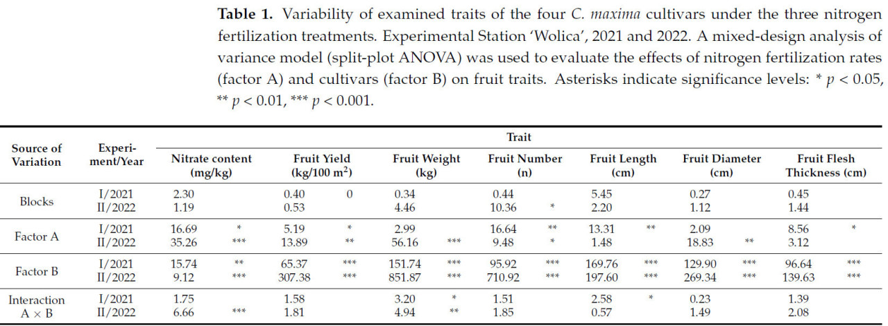 Несколько исследований указали, что колебания параметров плодов зимней тыквы зависят от сорта и условий окружающей среды. На сегодняшний день лишь несколько исследований изучали состав и урожайность зимней тыквы, произведенной в зонах с умеренным климатом, таких как Польша [18,19,23]. Также недостаточно знаний о накоплении нитратов сортами C. maxima в условиях изменяющейся азотной подкормки.