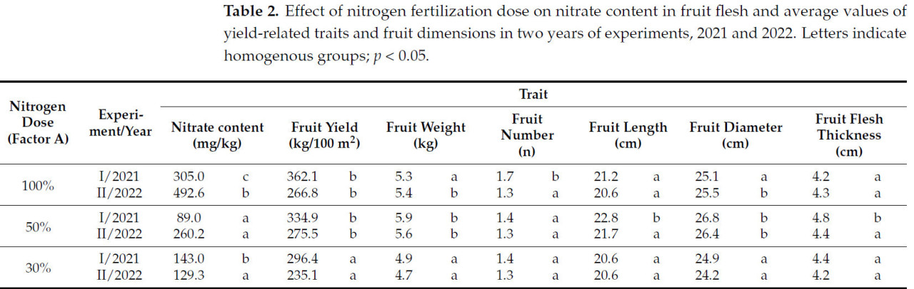 Таблица 2. Влияние дозы азотного удобрения на содержание нитратов в мякоти плодов и средние значения признаков, связанных с урожайностью, и размеров плодов за два года экспериментов, 2021 и 2022. Буквы обозначают однородные группы; p < 0,05.