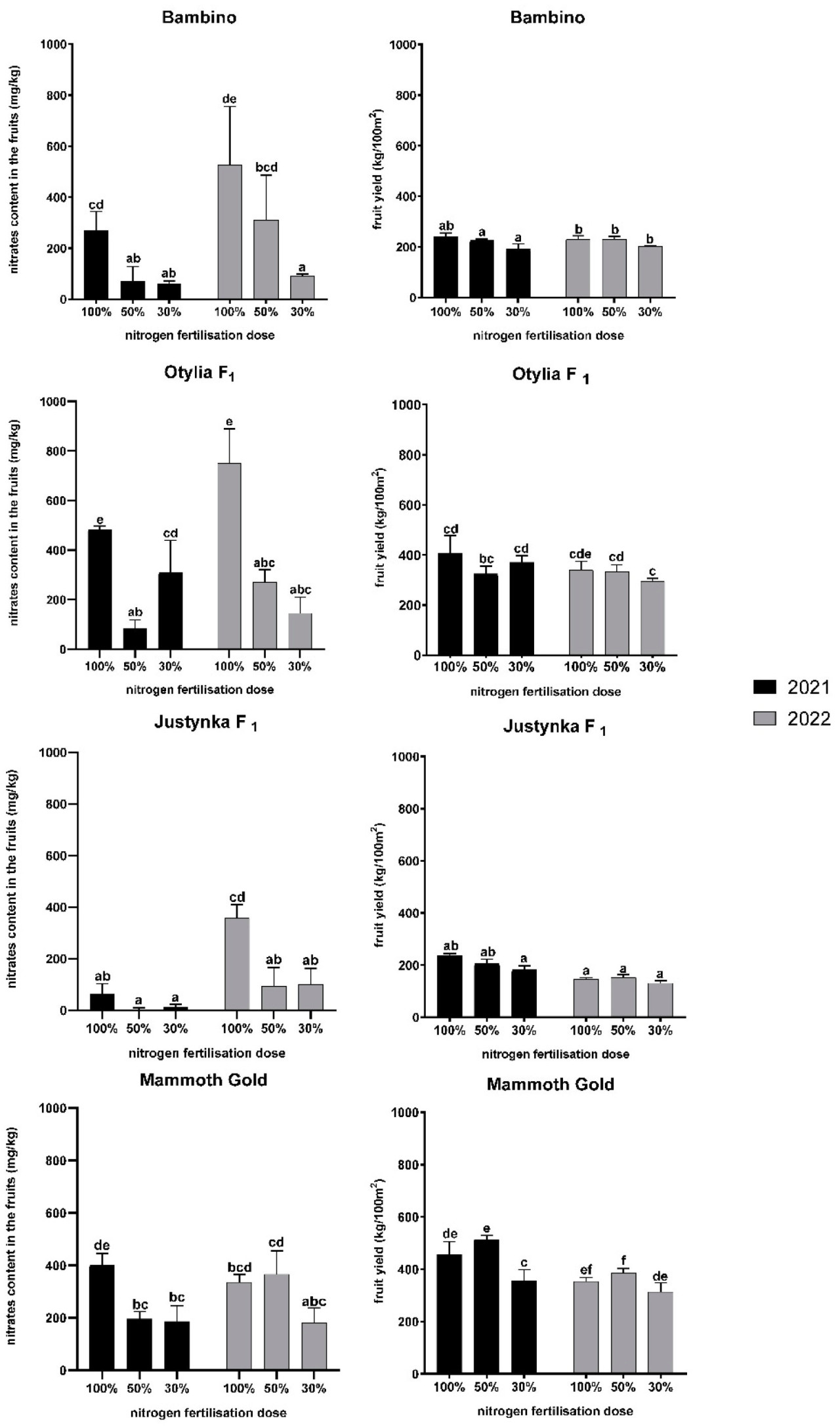 Выбранные для эксперимента сорта различались по учитываемым признакам (Таблица 3, Дополнительные таблицы S2 и S3). Оценивая результаты, полученные для отдельных сортов в оба года эксперимента, самое низкое содержание нитратов в мякоти плодов было обнаружено у Justynka F1, со средними значениями 27 мг/кг в 2021 году и 183,9 мг/кг в 2022 году. Среднее содержание нитратов у сортов Otylia F1 и Mammoth Gold было схожим в оба года: 293,0 и 261 мг/кг в 2021 году и 389,0 и 293,7 в 2022 году соответственно. Для сорта Bambino среднее содержание нитратов отличалось от других сортов в 2021 году, находясь на среднем уровне (135 мг/кг), тогда как в 2022 году оно было схожим с таковым у сортов Otylia F1 и Mammoth Gold (Таблица 3, Дополнительные таблицы S2 и S3). В 2021 году содержание нитратов для сорта Justynka F1 было очень низким при всех дозах азотного удобрения и не превышало 100 мг/кг. В 2022 году среднее содержание нитратов также не превышало 100 мг/кг для этого сорта, но только при дозах азотного удобрения 50% и 30%. Содержание нитратов в плодах Bambino и Otylia F1 было значительно ниже в оба года при 50% и 30% азотного удобрения, но самая низкая концентрация нитратов при удобрении 50% N наблюдалась у Justynka F1. Результаты для Mammoth Gold были схожи с результатами для этих двух сортов в первый год исследования, а во второй год не было обнаружено значительных различий в содержании нитратов в мякоти плодов в зависимости от доз азота (Рисунок 3, Дополнительные таблицы S2 и S3).