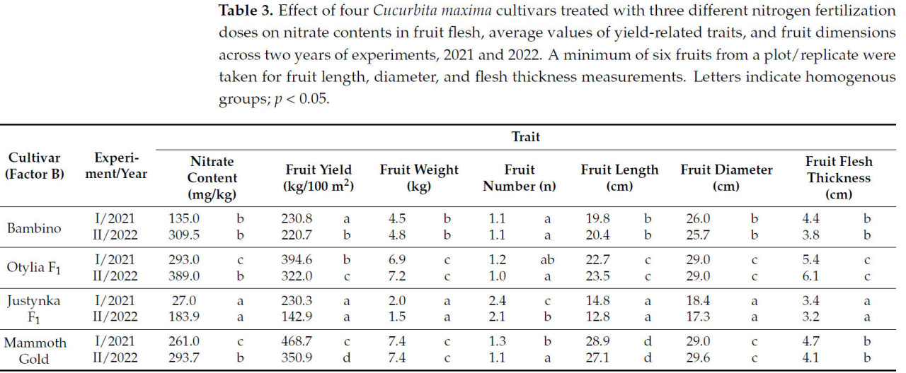 Таблица 3. Влияние четырех сортов Cucurbita maxima, обработанных тремя различными дозами азотного удобрения, на содержание нитратов в мякоти плодов, средние значения признаков, связанных с урожайностью, и размеров плодов за два года экспериментов, 2021 и 2022. Для измерений длины, диаметра и толщины мякоти плодов брали минимум шесть плодов с делянки/повторности. Буквы обозначают однородные группы; p < 0,05.