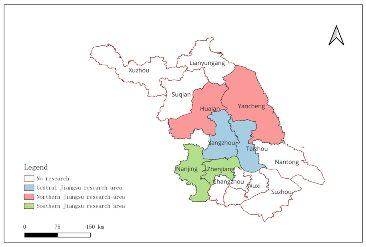 Провинция Цзянсу, с развитой экономикой и концентрированным населением, является крупной сельскохозяйственной провинцией в Китае, которая выпустила политики, такие как «План действий по контролю за загрязнением в сельском хозяйстве и сельской местности в провинции Цзянсу (2021–2025)», который является репрезентативным для соответствующих исследований. Относительно регионального состава выборки, CLES охватывает южный Цзянсу (Нанкин, Чжэньцзян), центральный Цзянсу (Янчжоу, Тайчжоу) и северный Цзянсу (Хуайань, Яньчэн) (Рисунок 1). Региональная культура и экономические уровни северного, центрального и южного Цзянсу очевидно различны, и уровень сельского развития имеет очевидные градиентные характеристики. Характеристики сельских районов северного Цзянсу похожи на те, что в северном Китае. Уровень сельского экономического развития в центральном и южном Цзянсу относительно высок, что может представлять текущую ситуацию сельского развития в развитых районах и похож на ситуацию по всей стране. Это разумно и репрезентативно изучать национальные сельские вопросы с данными CLES провинции Цзянсу как образцом.