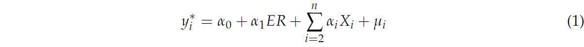 В приведенном выше уравнении 𝑦∗𝑖 - это скрытая переменная, которая не наблюдается напрямую, 𝐸𝑅𝑖 - это экологическое регулирование, 𝑋𝑖 - это контрольная переменная, 𝛼0 - это перехват, 𝛼𝑖 - это коэффициент объясняющей переменной, 𝜇𝑖 - это случайная ошибка, и 𝑖 - это размер выборки. Эмпирическая модель уровня сортировки отходов строится через скрытые переменные:
