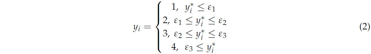 В уравнении (2) 𝑦𝑖 - это уровень классификации бытовых отходов сельских жителей, ranging от 1 до 4. 𝜀1, 𝜀2 и 𝜀3 - это точки отсечения 𝑦∗𝑖. То есть, если все отходы выбрасываются вместе без какой-либо сортировки, значение присваивается как 1. Если сельские жители могут отделить перерабатываемые/продаваемые бытовые отходы на две категории, значение присваивается как 2. Если пищевые отходы/гниющие отходы в бытовых отходах могут быть дополнительно отделены и бытовые отходы могут быть классифицированы на три категории, значение присваивается как 3. Если опасные отходы могут быть отделены и бытовые отходы могут быть классифицированы на четыре категории, значение присваивается как 4, как показано в Таблице 1.