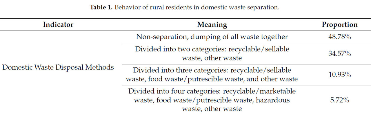 Чтобы стимулировать сортировку отходов среди сельских жителей, ученые исследовали поведение сельских жителей в отношении сортировки бытовых отходов, в основном фокусируясь на готовности [3,4], поведении [5,6] и эффективности [7,8].