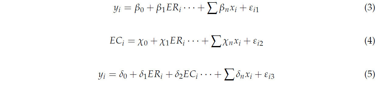 В уравнениях (3) до (5) 𝑀𝑖 - это экологическое сознание (посредник). Уравнение (3) представляет общий эффект экологического регулирования на уровень сортировки бытовых отходов сельскими жителями. Уравнение (4) представляет эффект экологического регулирования на опосредующую переменную экологического сознания. Между тем, коэффициент 𝛿2 в уравнении (5) представляет прямой эффект опосредующей переменной экологического сознания на уровень сортировки бытовых отходов сельских жителей. Опосредующий эффект опосредующей переменной может быть получен как произведение 𝜒1𝛿2.