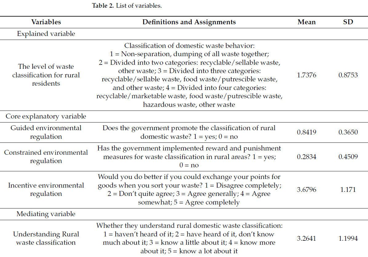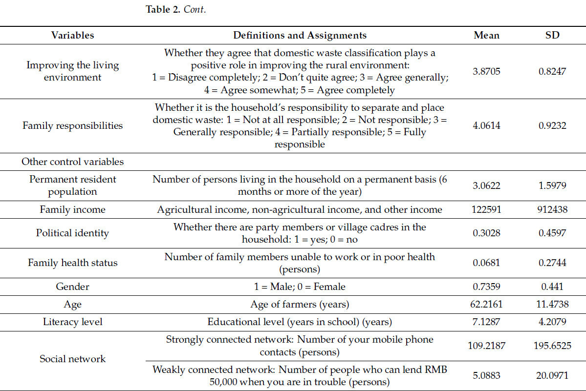 В дополнение к экологическим нормативам и представлениям, поведение сельских жителей в сегрегации и утилизации бытовых отходов может быть связано с переменными, такими как их уровень грамотности, размер домохозяйства, пол и социальная сеть. Основываясь на работе [13,39,40,41], были выбраны переменные характеристик респондента (пол, возраст и уровень грамотности), переменные семейных характеристик (постоянное резидентное население, семейный доход, политическая идентичность и семейный статус здоровья) и переменные социальной сети (сильно связанная сеть и слабо связанная сеть) как контрольные переменные (Таблица 2).