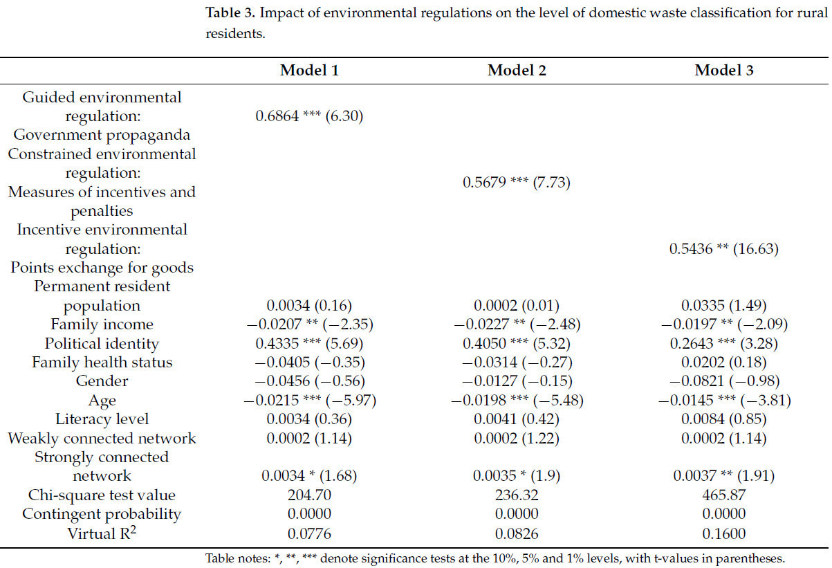 Было обнаружено четыре значимых фактора, влияющих на поведение сельских жителей по сортировке бытовых отходов. Среди них доход домохозяйства респондентов оказывает негативное влияние на уровень сортировки бытовых отходов. Чем ниже доход домохозяйства, тем больше склонность сортировать и утилизировать экономически ценные предметы для переработки и утилизации или повторного использования. Чем выше доход домохозяйства, тем более обеспечены их жизненные условия и тем больше бытовых отходов они производят. Чем выше затраты на сортировку и утилизацию отходов, тем больше ожидаемый доход от поведения по сортировке и утилизации отходов. Следовательно, доход домохозяйства, вероятно, снижает вероятность сортировки и утилизации отходов. Этот вывод согласуется с направлением воздействия, указанным в предыдущих исследованиях. Политическая идентичность оказывает положительное влияние на уровень сортировки бытовых отходов. Политическая идентичность членов партии и деревенских кадров, которые лучше понимают политику управления бытовыми отходами, более способны повышать уровень сортировки бытовых отходов благодаря своей ведущей роли и движущей силе в сельской местности гуманного общества. Возраст оказывает негативное влияние на уровень сортировки бытовых отходов сельскими жителями. Пожилые люди, находясь под влиянием своих жизненных привычек, более склонны утилизировать свои бытовые отходы немаркированным способом. Поэтому необходимо усилить руководство для пожилых людей. Сильная сеть отношений оказывает положительное влияние на уровень сортировки бытовых отходов. Количество друзей и родственников, у которых можно занять деньги, отражает масштаб и качество социальной сети сельских жителей. Чем сильнее социальная сеть, тем быстрее поток и распространение информации, и тем удобнее получать информацию о сортировке бытовых отходов. Это может помочь повысить уровень сортировки бытовых отходов сельскими жителями.