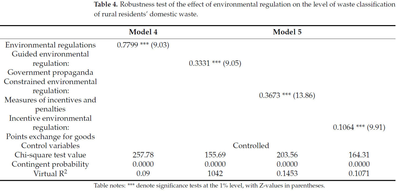 Таблица 4.Проверка устойчивости влияния нормирования окружающей среды на уровень классификации бытовых отходов сельских жителей.
