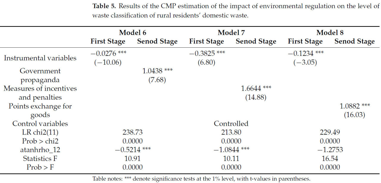 В этом разделе рассматривается метод условного смешанного процесса (CMP), предложенный Рудманом для переоценки влияния экологического регулирования на уровень классификации отходов для сельских жителей [45]. Метод CMP делится на два этапа. Первый этап — поиск подходящих инструментальных переменных для решения потенциальной проблемы эндогенности между зависимыми и независимыми переменными и оценка корреляции между инструментальными переменными и независимыми переменными. Второй этап — включение инструментальных переменных в эмпирическую модель и оценка экзогенности основных объясняющих переменных с использованием оценочных коэффициентов тестового параметра эндогенности atanhrho_12. Если оценочный коэффициент тестового параметра atanhrho_12 существенно отличался от 0, это означало, что в модели присутствовала эндогенность и результаты этой модели были достоверными. Результаты моделирования CMP показаны в Таблице 5.