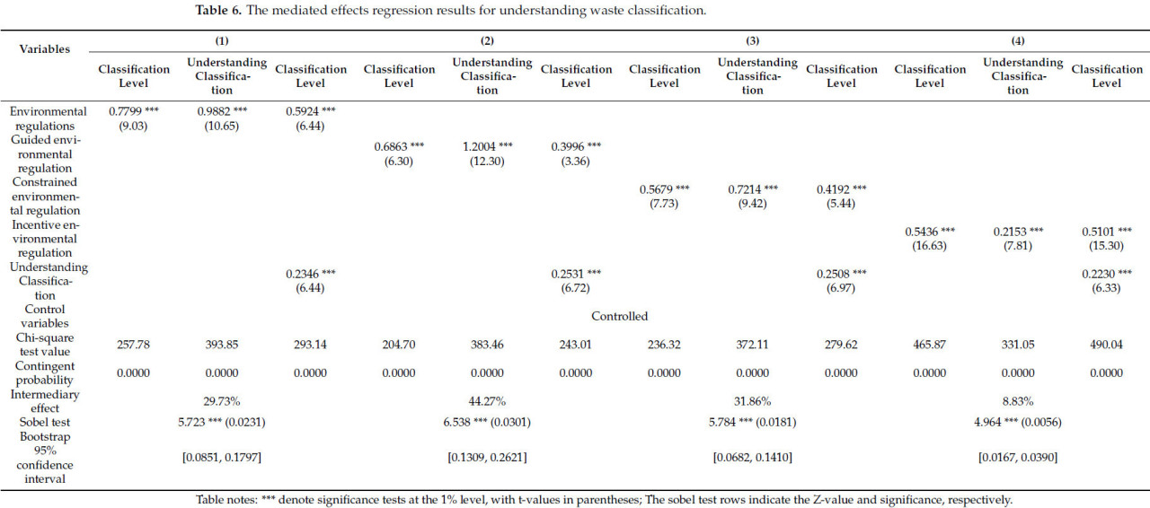 В итоге, экологические нормативы могут косвенно способствовать более высоким уровням сортировки бытовых отходов, способствуя пониманию сортировки бытовых отходов и улучшая личное и семейное чувство ответственности за улучшение среды обитания человека, а эффекты посредничества составляют 29.73%, 20.14% и 16.63%, соответственно. Экологическое сознание играет значительную посредническую роль в процессе воздействия экологического регулирования на уровень сортировки бытовых отходов. Гипотезы H2a, H2b, H2c были проверены.
