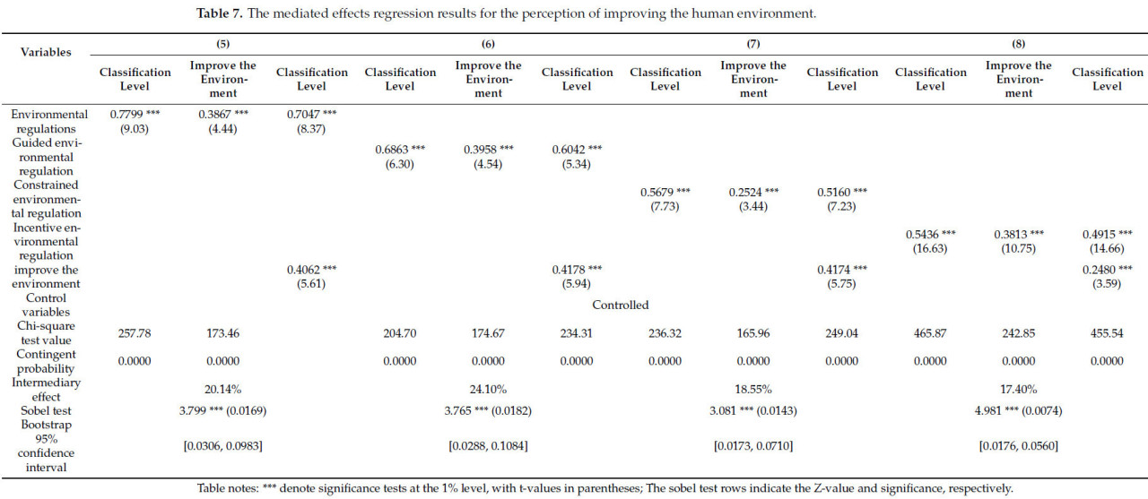 Посредническая роль восприятия «улучшения среды обитания человека» в экологическом регулировании, влияющем на уровень классификации бытовых отходов сельских жителей, показана в Таблице 7, и все результаты проходят тест на значимость и тест на опосредующий эффект. Экологические нормативы могут значительно увеличить признание сельских жителей, что, в свою очередь, способствует увеличению уровня сортировки бытовых отходов, и восприятие «улучшения среды обитания человека» играет важную роль в процессе посредничества. Эффект посредничества составляет около 20.14% от общего эффекта. С точки зрения неоднородности экологических нормативов, эффекты посредничества восприятия «улучшения среды обитания человека» в процессах направляющего экологического регулирования, ограничивающего экологического регулирования и стимулирующего экологического регулирования на уровень сортировки отходов составляют 24.10%, 18.55% и 17.40% от общего эффекта, соответственно.