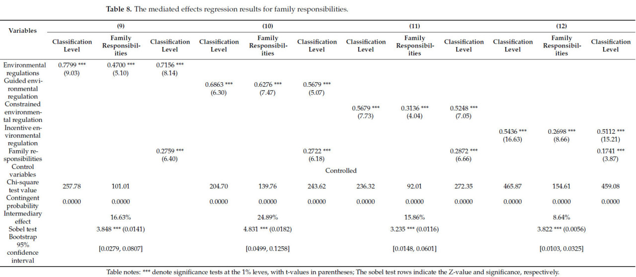 Результаты регрессии опосредованных эффектов для семейных обязанностей в экологическом регулировании, влияющих на уровень классификации бытовых отходов сельских жителей, показаны в Таблице 8; результаты проходят тест на значимость и тест на опосредующий эффект. Экологическое регулирование может значительно стимулировать сортировку бытовых отходов сельскими жителями, вытекающую из чувства ответственности семьи, тем самым способствуя уровню классификации бытовых отходов; эффект посредничества чувства ответственности составляет 16.63% от общего эффекта. Учитывая неоднородность экологических нормативов, чувство семейной ответственности, в процессе направляющего экологического регулирования, ограничивающего экологического регулирования и стимулирующего экологического регулирования, влияет на уровень сортировки бытовых отходов. Эффект посредничества составил долю от общего эффекта следующим образом: 24.89%, 15.86% и 8.64%, соответственно.
