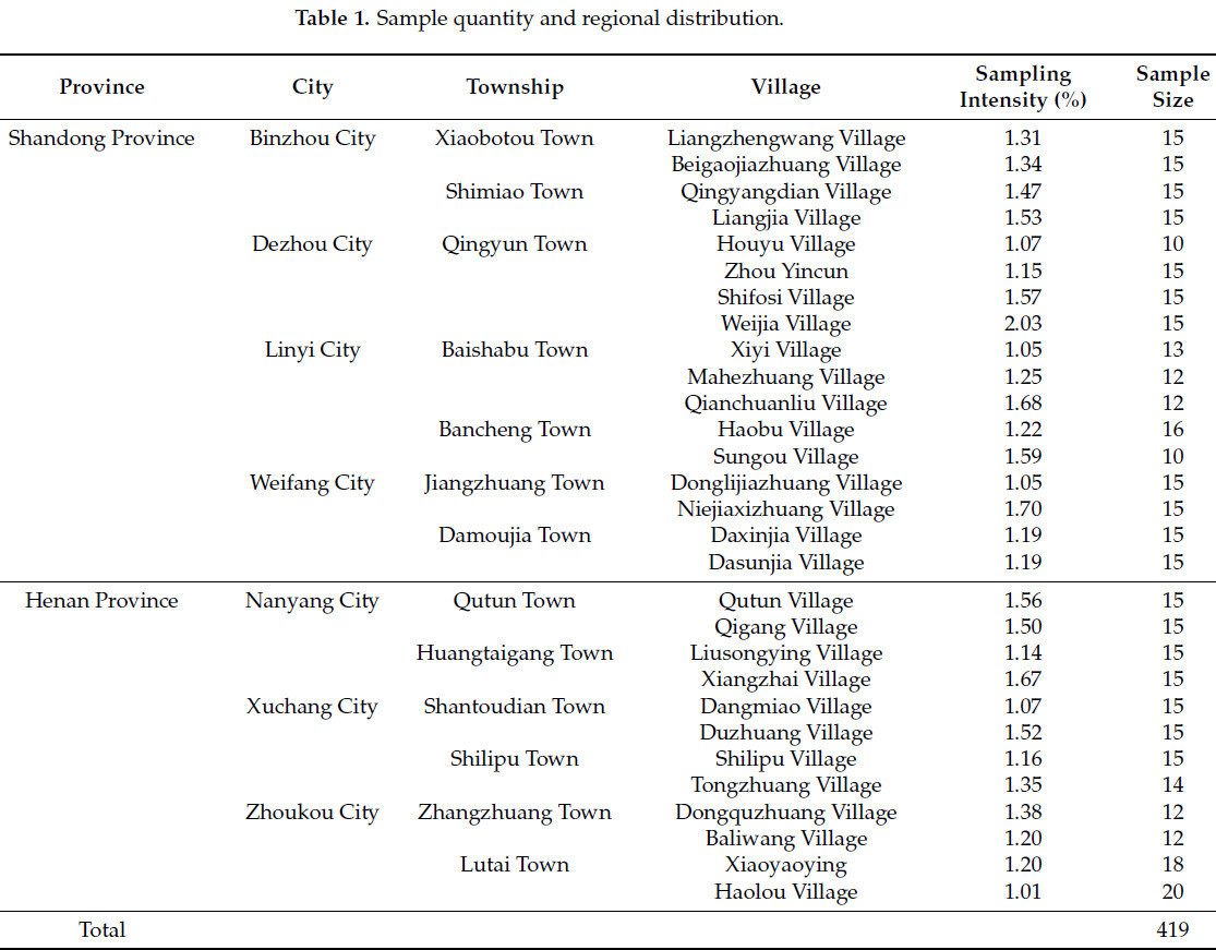 Данные в этом исследовании в основном получены из полевого обследования фермеров, проведенного в провинциях Шаньдун и Хэнань в период с июля по сентябрь 2024 года. Причины выбора провинций Шаньдун и Хэнань в качестве районов обследования следующие: Во-первых, развитие зеленых технологий контроля в провинциях Шаньдун и Хэнань является многообещающим. В первой группе национальных «демонстрационных округов зеленого контроля» для вредителей и болезней сельскохозяйственных культур, объявленных Национальным центром сельскохозяйственных технологий в 2020 году, были рекомендованы 10 округов в Шаньдуне и 8 в Хэнани, что отражает позитивное развитие и применение зеленых технологий контроля в обеих провинциях. Во-вторых, Шаньдун и Хэнань являются основными сельскохозяйственными провинциями в Китае, а также одними из наиболее пострадавших от вредителей и болезней. Борьба с вредителями и болезнями является серьезной проблемой в этих провинциях, при этом использование пестицидов неизменно занимает одно из самых высоких мест в Китае. Давление на контроль загрязнения в сельском хозяйстве высокое, что создает большой спрос на зеленые технологии контроля.