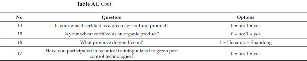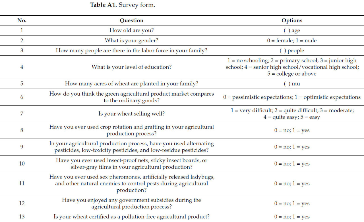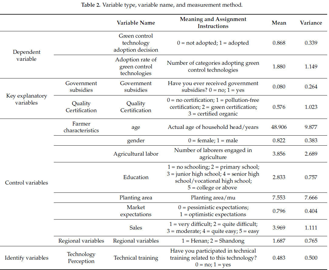Зависимой переменной является решение фермеров использовать зеленые технологии борьбы с вредителями и степень их внедрения, как показано в таблице 2. Зеленые технологии борьбы с вредителями делятся на четыре категории (сельскохозяйственные технологии борьбы с вредителями, физические технологии борьбы с вредителями, научные технологии применения пестицидов и биологические технологии борьбы с вредителями) [ 14 ].