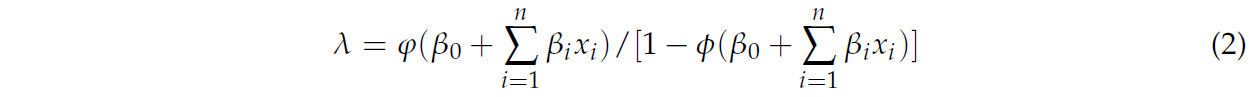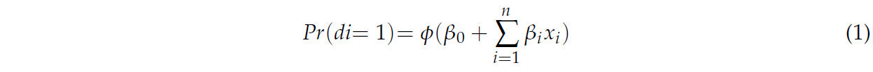 𝑃 𝑟 — зависимая переменная, представляющая вероятность события, в частности, вероятность принятия фермерами решений о принятии (𝑑𝑖 = 1, что указывает на то, что были приняты экологически чистые технологии борьбы с вредителями; 𝑑𝑖 = 0, что указывает на отсутствие применения экологичных технологий борьбы с вредителями. Правая часть формулы представляет собой кумулятивную функцию нормального распределения, 𝛽0 — постоянный член уравнения регрессии, а𝑥𝑖( 𝑖 = 1 … 𝑛 ) относится к n факторам, которые влияют на выборку фермеров, 𝛽𝑖 — соответствующий параметр, подлежащий оценке. В данной работе используется пробит-модель для оценки вероятности внедрения для каждого фермера из выборки и рассчитывается поправочный коэффициент, как показано ниже: