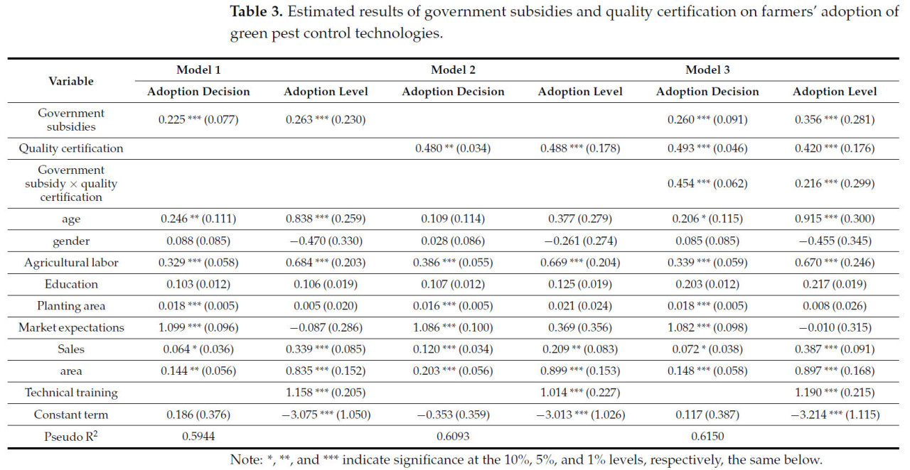 (1) Государственные субсидии, сертификация качества и их взаимодействие могут стимулировать фермеров к внедрению экологичных технологий борьбы с вредителями. То есть, чем выше уровень сертификации качества при одинаковом уровне государственных субсидий, тем выше вероятность того, что фермеры внедрят экологичные технологии борьбы с вредителями. Другими словами, при одинаковом уровне сертификации качества, получая государственные субсидии, фермеры с большей вероятностью внедрят экологичные технологии борьбы с вредителями.