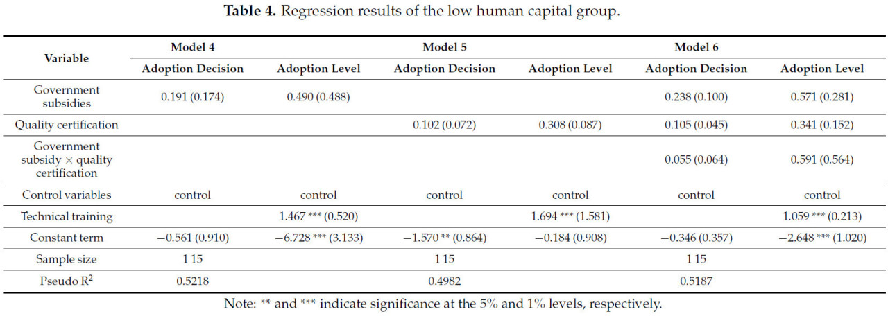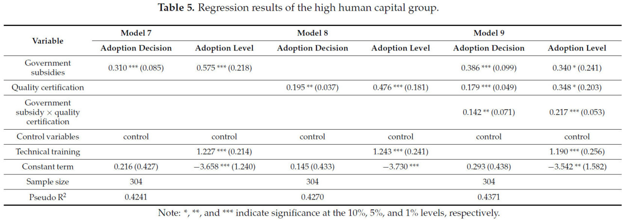 С точки зрения количества человеческого капитала, в данной статье в качестве показателя измерения выбрано количество сельскохозяйственных рабочих. Согласно условиям опроса, эта группа разделена на группу с высоким количеством человеческого капитала и группу с низким количеством человеческого капитала в зависимости от уровня сельскохозяйственного труда ниже и выше среднего значения (среднее значение составляет 3,856). Это позволяет изучить, влияет ли разница в обеспеченности человеческим капиталом на поведение фермеров в отношении принятия ими экологичных технологий борьбы с вредителями. Согласно эмпирическим результатам, представленным в таблицах 4 и 5 , для группы с низким количеством государственные субсидии и сертификация качества не оказывают существенного влияния на решения фермеров о принятии или степени принятия экологичных технологий борьбы с вредителями. Одним из возможных объяснений является то, что экологичные технологии борьбы с вредителями требуют значительных трудовых и материальных ресурсов для управления полями, что налагает определенные требования к рабочей силе. Для группы с высоким количеством государственные субсидии и сертификация качества существенно влияют на принятие решений фермерами и уровень принятия экологичных технологий борьбы с вредителями. Возможная причина заключается в том, что при большей численности сельскохозяйственной рабочей силы более совершенные и стандартизированные посевные работы могут быть выполнены посредством разделения труда. Кроме того, совокупный эффект государственных субсидий и сертификации качества еще больше стимулирует фермеров внедрять экологически чистые технологии борьбы с вредителями.