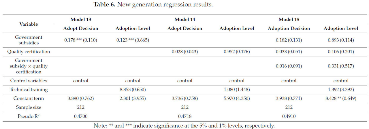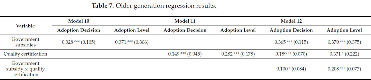 Судя по эмпирическим результатам в Таблице 7 , государственные субсидии оказывают значительное влияние на внедрение зеленых технологий борьбы с вредителями фермерами пожилого возраста, что указывает на то, что субсидии повысили энтузиазм пожилых фермеров в отношении внедрения. Сертификация качества оказывает значительное влияние на их зеленые технологии борьбы с вредителями. Возможная причина заключается в том, что старшее поколение фермеров находится в невыгодном положении в несельскохозяйственной занятости. Сертификация качества способствует увеличению доходов в сельском хозяйстве, и они, как правило, внедряют зеленые технологии борьбы с вредителями, чтобы пройти сертификацию качества. Взаимодействие между сертификацией качества и государственными субсидиями оказывает значительное положительное влияние на поведение старшего поколения фермеров в отношении внедрения зеленых технологий борьбы с вредителями. Взаимодействие между сертификацией качества и государственными субсидиями значительно способствует внедрению зеленых технологий борьбы с вредителями фермерами пожилого возраста. Это подчеркивает важность рассмотрения индивидуального воздействия этих факторов, а также их совокупного влияния на внедрение зеленых технологий борьбы с вредителями фермерами пожилого поколения.