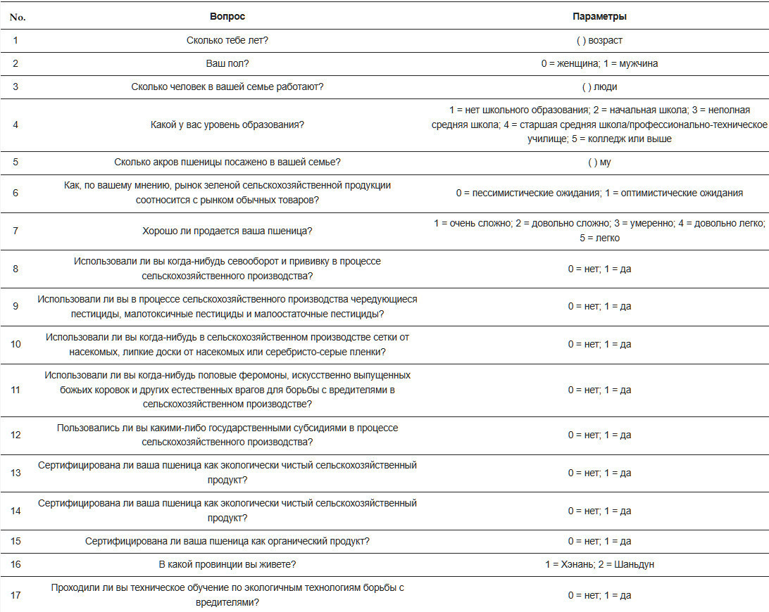 Контрольные переменные: ссылаясь на существующие исследования [ 17 , 18 , 19 , 20 ], в качестве контрольных переменных были выбраны пол, возраст, уровень образования, сельскохозяйственная рабочая сила, площадь посадки, рыночные ожидания, ситуация с продажами, региональные переменные и переменные сорта опрошенных фермеров.
