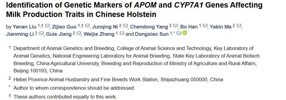 Наше предыдущее исследование определило гены аполипопротеина М (APOM) и полипептида 1 подсемейства А цитохрома P450 семейства 7 (CYP7A1) как кандидатов на молочные признаки у молочного скота, которые были значительно повышены в ткани печени коров голштинской породы между периодами сухостоя и лактации. Два гена играют критическую роль в пути рецептора, активируемого пролифераторами пероксисом (PPAR). В этом исследовании мы дополнительно подтвердили, имели ли гены APOM и CYP7A1 значительное генетическое влияние на признаки молочной продуктивности в популяции китайских голштинов.