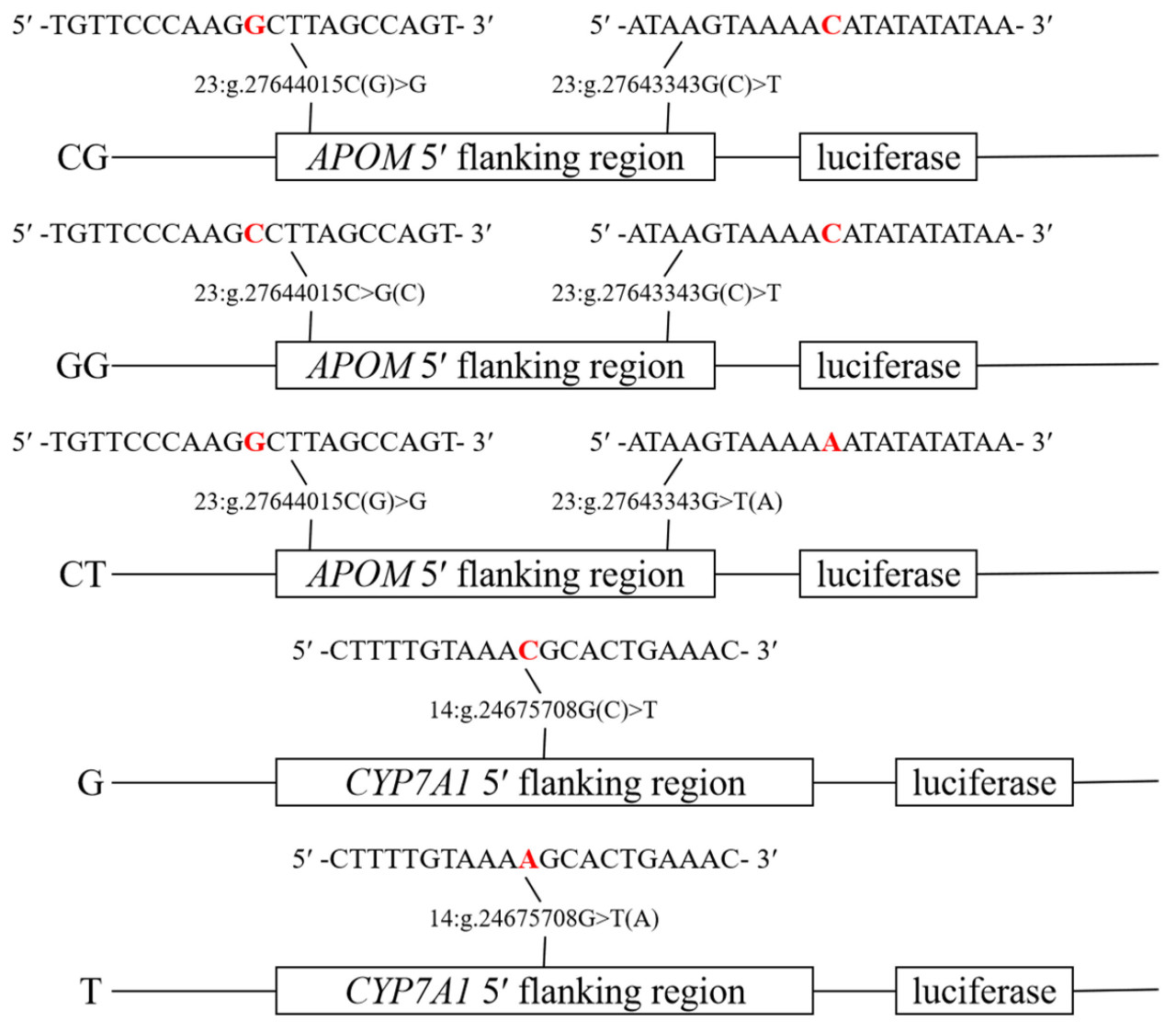 Рисунок 1. Эскизы рекомбинантных плазмид. Красный текст обозначает различные аллели. CG, GG и CT: Эскизы гена APOM рекомбинантных плазмид. C и A: Эскизы гена CYP7A1 рекомбинантных плазмид.