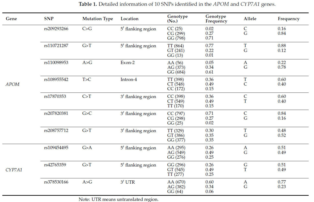 Таблица 1. Подробная информация о 10 однонуклеотидных полиморфизмах (SNP), выявленных в генах APOM и CYP7A1 .