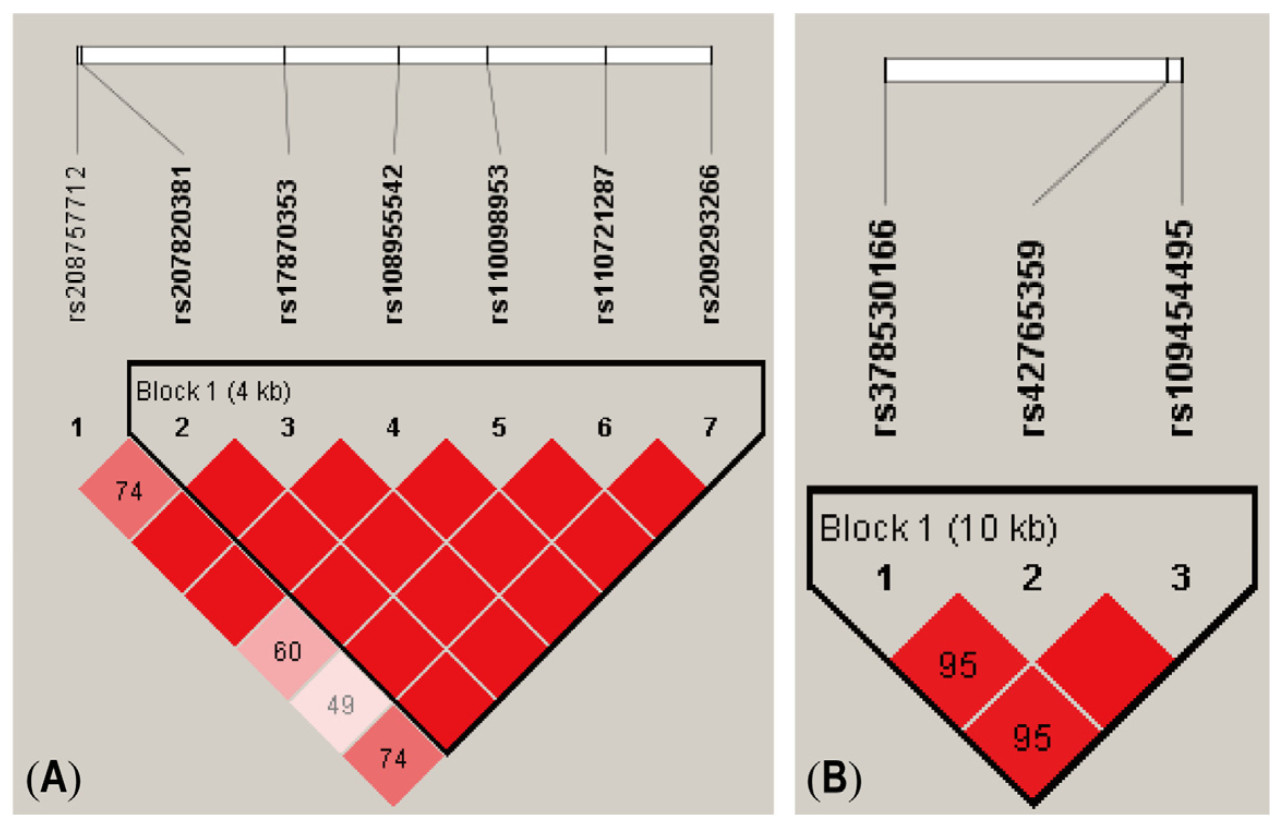 Рисунок 2. Распространение LD среди выявленных SNP в APOM и CYP7A1 . Текст над блоками гаплотипов содержит названия SNP. Числа в блоках гаплотипов представляют D′: чем краснее блоки гаплотипа, тем сильнее LD. ( A ) LD среди 7 SNP в APOM . ( B ) LD среди 3 SNP в CYP7A1 .