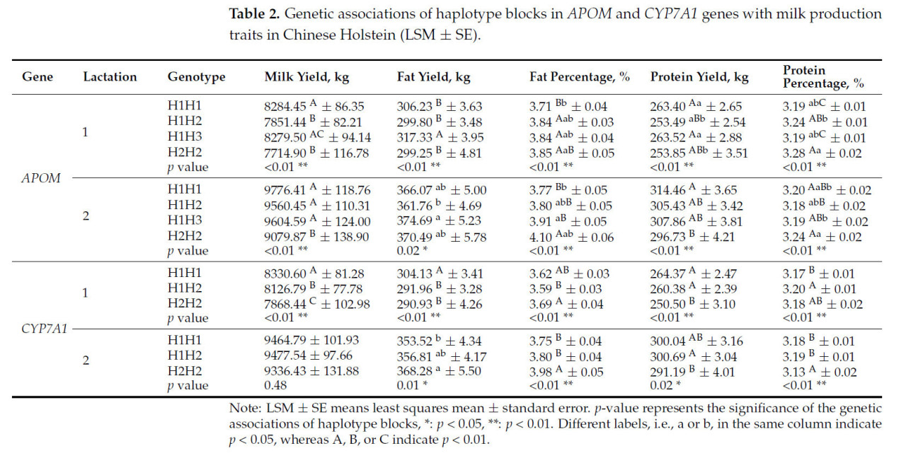 Таблица 2. Генетические ассоциации блоков гаплотипов в генах APOM и CYP7A1 с признаками молочной продуктивности у китайских голштинов (LSM ± SE).