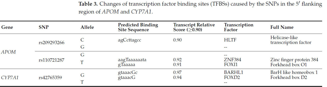 Во-первых, мы использовали программное обеспечение Jaspar 2024 для оценки замен TFBS трех SNP (rs209293266, rs110721287 и rs42765359) в 5′-промоторной области генов APOM и CYP7A1 (таблица 3).
