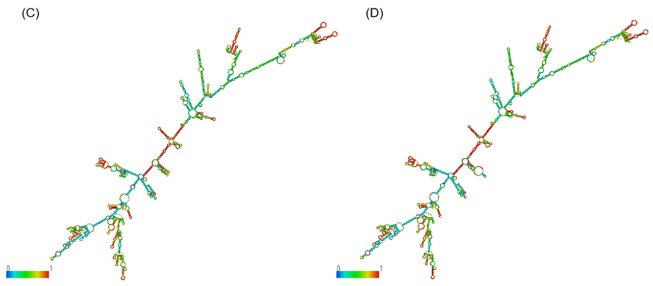 Рисунок 4. Прогнозирование вторичной структуры мРНК для однонуклеотидных полиморфизмов (SNP) в экзонах и нетранслируемых областях APOM и CYP7A1 . ( A ) Вторичная структура мРНК мутации A rs110098953 в APOM . ( B ) Вторичная структура мРНК мутации G rs110098953 в APOM . ( C ) Вторичная структура мРНК мутации A rs378530166 в CYP7A1. (D) Вторичная структура мРНК мутации G rs378530166 в CYP7A1 . Различные цвета представляют вероятность комплементарного спаривания оснований в последовательностях РНК, при этом вероятность варьируется от 0 до 1 с использованием синего к красному.