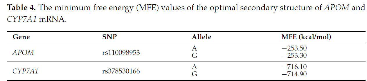 Для оценки влияния (относительная оценка ≥ 0,90) однонуклеотидных полиморфизмов (SNP) в 5'-фланкирующих областях генов APOM и CYP7A1 на сайты связывания факторов транскрипции (TFBS) использовалось программное обеспечение Jaspar 2024 ( http://jaspar.genereg.net/ , дата обращения 25 июня 2024 г.) . Изменения во вторичной структуре мРНК, затрагивающие SNP в нетранслируемых областях (UTR), и экзоны были спроецированы с помощью веб-сервера RNAfold (http://rna.tbi.univie.ac.at/cgi-bin/RNAWebSuite/RNAfold.cgi , дата обращения 25 июня 2024 г.), в котором стабильность структуры мРНК определяется минимальной свободной энергией (MFE) оптимальной вторичной структуры и обратно пропорциональна стабильности структуры мРНК.