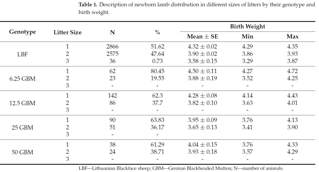 Все записи были получены из регистра данных, который регулярно собирается и ведется в UAB «Genetiniai Ištekliai». На этой ферме разводят литовских черноголовых овец (ЛЧО) и выводят новую линию отцов путем интрогрессии немецкой черноголовой баранины (ГЧМ). Для анализа использовались чистокровные литовские черноголовые овцы (порода ЛЧО была представлена в 4 поколениях) и их помеси с содержанием крови немецкой черноголовой баранины 6,25%, 12,5%, 25% и 50%. В данном исследовании использовались данные о плодовитости (количество ягнят, рожденных за один ягненок) 5486 овец и их весе за период с 2018 по 2023 год. Ягнят взвешивали при рождении, и регистрировали пол каждого ягненка. Вес ягнят также регистрировали при рождении и в 2, 3, 4, 8 и 12 месяцев.