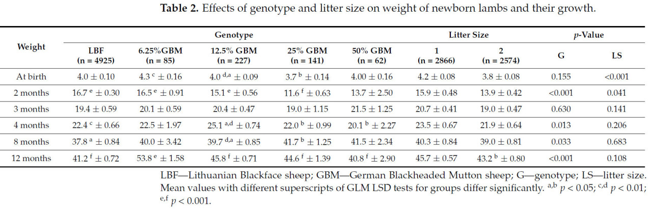 Данные были подвергнуты дисперсионному анализу с помощью общей линейной процедуры (GLM) в IBM SPSS Statistics 29 для Windows, версия 29, Армонк, штат Нью-Йорк, США: программное обеспечение IBM Corp., с использованием LSD-тестов для определения значимости различий в оценочных маргинальных средних (EM) между группами. Модель GLM включала фиксированные факторы группы генотипов (чистопородные литовские черноголовые овцы и 6,25%, 12,5%, 25% и 50% доли немецкой черноголовой баранины, сезон ягнения и пол ягнёнка) и взаимодействия факторов (генотип × размер помёта; генотип × пол; генотип × сезон; и сезон × размер помёта). Различия считались значимыми при p < 0,05.
