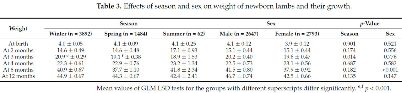 Большинство овец (71,4%) ягнились один раз в год зимой (декабрь–февраль), 27,3% ягнений произошли весной (март–май), 1,1% произошли летом и только 2 произошли (0,04%) осенью. Различий в весе ягнят, рожденных в разные сезоны, не было, за исключением ягнят в трехмесячном возрасте ( таблица 3 ). Ягнята, рожденные зимой, были на 1,8 кг тяжелее ( p < 0,010) в трехмесячном возрасте, чем ягнята, рожденные весной. Пол, по-видимому, имел влияние только в возрасте восьми месяцев, когда разница в весе между самцами и самками увеличивалась ( p < 0,001) до 3,6 кг.