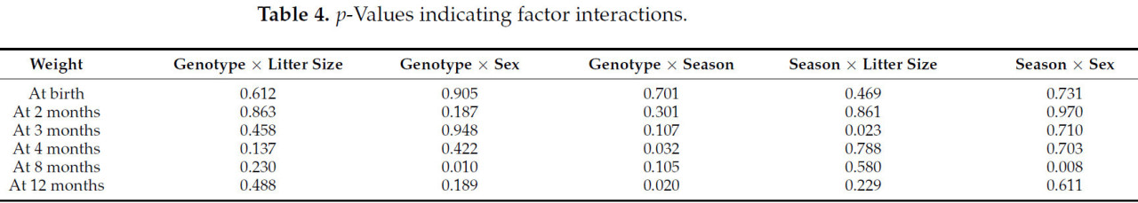 Были выявлены значимые взаимодействия ( p < 0,010 и p < 0,05) относительно веса в возрасте восьми месяцев между генотипом ягненка и полом, а также между сезоном ягнения и полом, соответственно ( Таблица 4 ). Чистопородные самцы LBF показали вес на 6,8 кг больше, а помесные с GBH от 12,5% до 50% показали вес на 2,6–5,3 кг больше по сравнению с самками; однако помесные самцы с GBH 6,25% показали вес на 1,5 кг меньше, чем самки. Самцы, родившиеся зимой, весной и летом в возрасте восьми месяцев, были на 4,3 кг, 2,9 кг и 3 кг тяжелее по сравнению с самками соответственно.