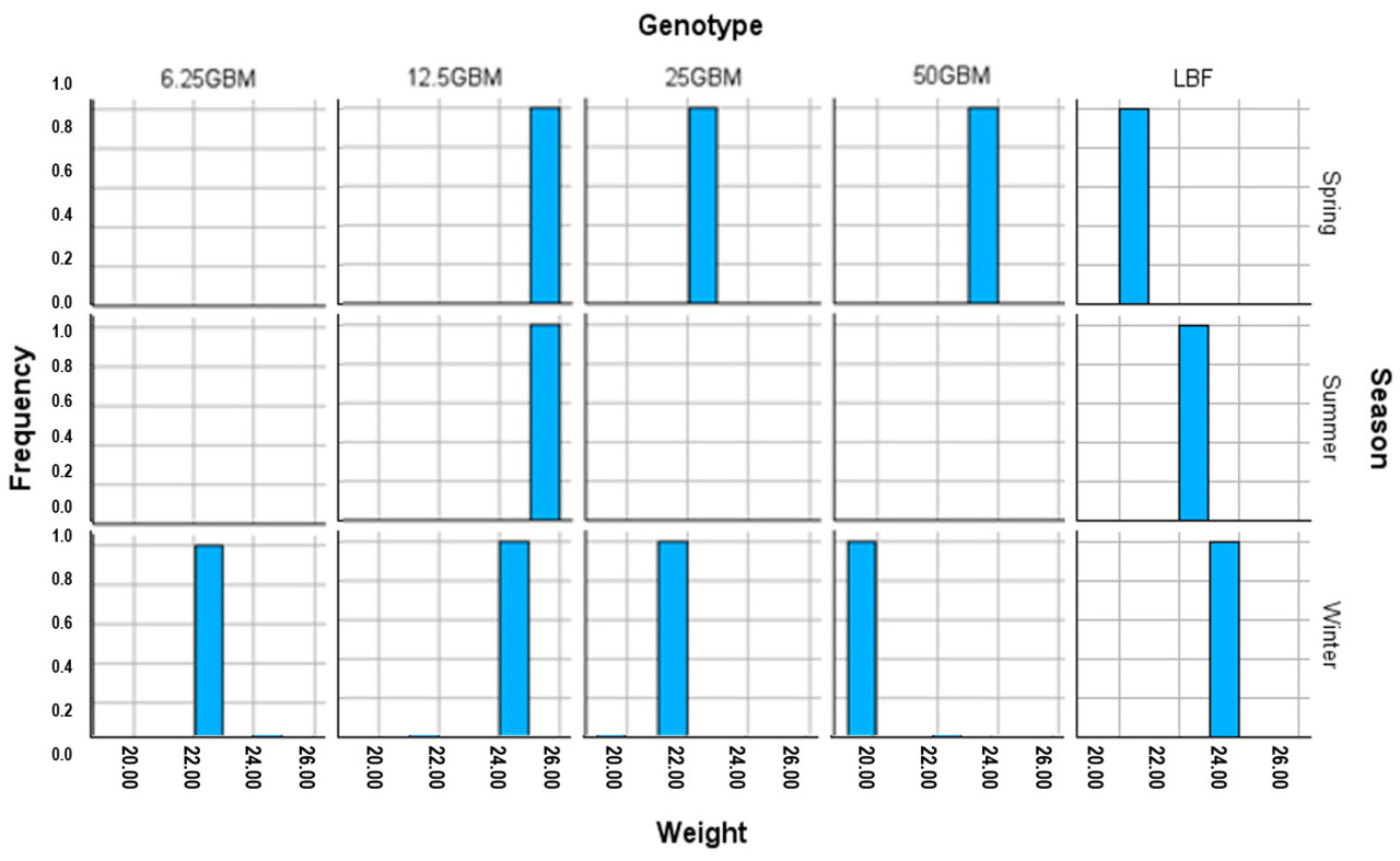 Также наблюдались значимые взаимодействия ( p < 0,05) между генотипом и сезоном во время роста ягнят в возрасте трех, четырех и двенадцати месяцев. Чистопородные ягнята LBF, рожденные зимой в возрасте четырех и двенадцати месяцев, имели более высокий вес, чем животные, рожденные весной; однако в четырехмесячном возрасте помесные ягнята, рожденные зимой, имели более низкий вес, чем ягнята, рожденные весной ( Рисунок 1 ). В возрасте двенадцати месяцев более высокая живая масса была продемонстрирована не только у чистопородных ягнят LBF, но и у помесных ягнят, за исключением помесей с 25% GBH, рожденных зимой, по сравнению с животными, рожденными весной.