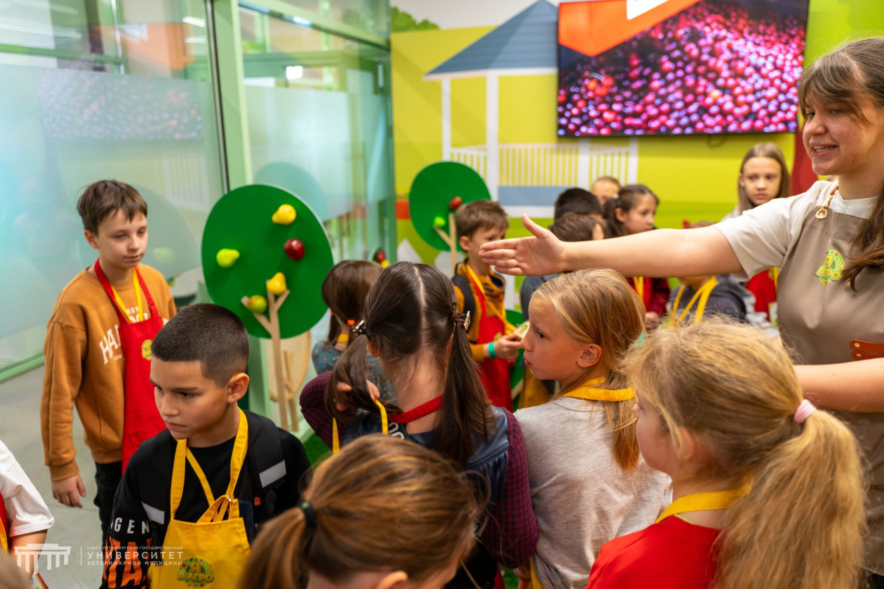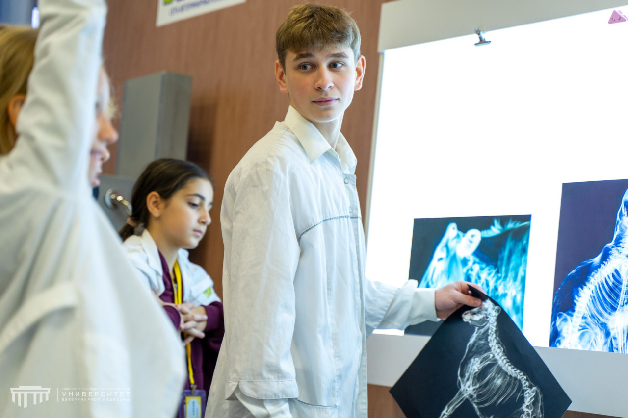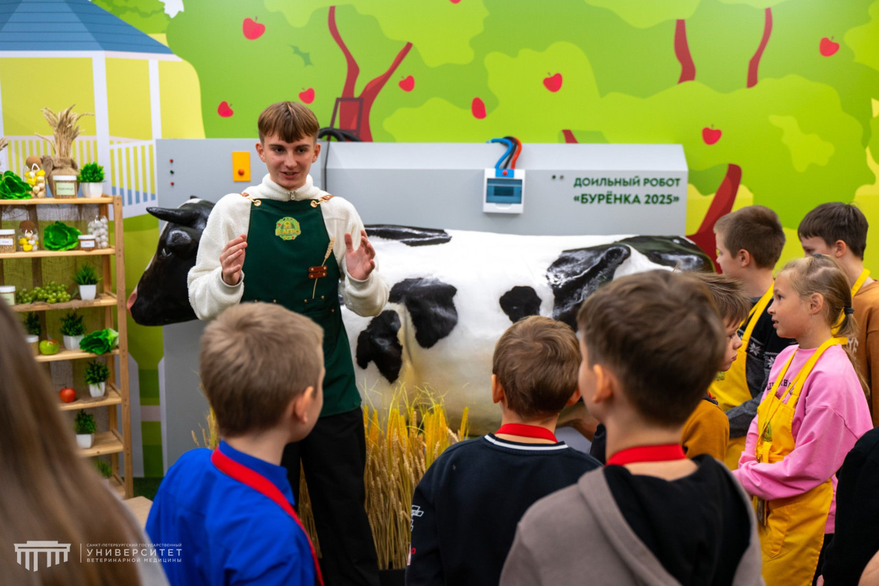 Программа была организована в двух форматах в зависимости от возраста участников. Младшие школьники знакомились с основами ветеринарной медицины и животноводства — пробовали определять качество молока в лаборатории, подбирали рацион для сельскохозяйственных животных с помощью интерактивных панелей и учились работать с учебным рентген-аппаратом.