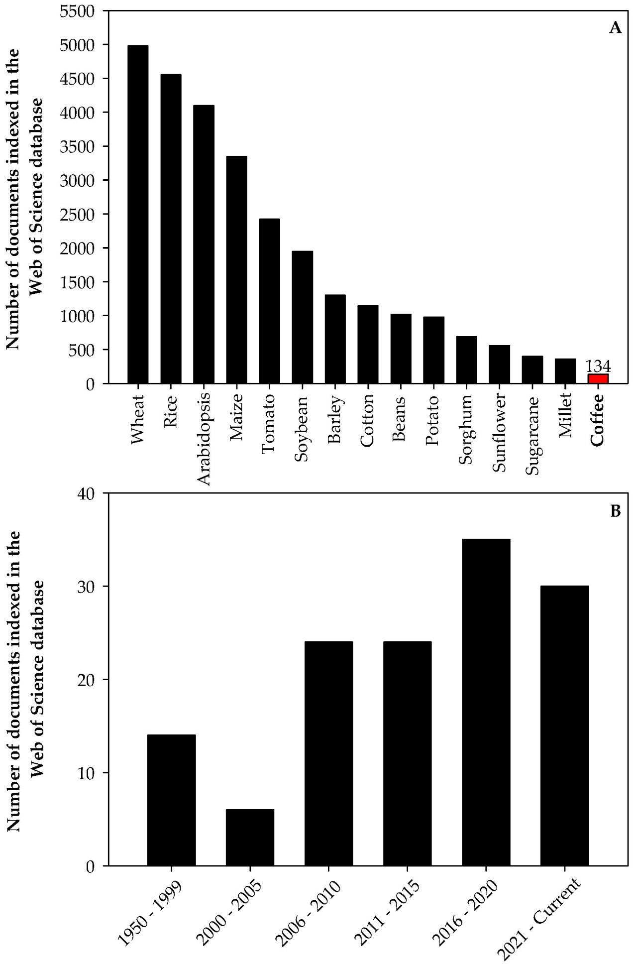 Засушливые условия, избыточное освещение, высокие температуры, недостаточная доступность питательных веществ в почве и засоление являются наиболее важными абиотическими стрессами в сельском хозяйстве [9,10,11,12,13]. Абиотические стрессы влияют на физиологическое состояние растений, оказывая заметное воздействие на молекулярном, биохимическом и морфологическом уровнях и могут вызывать необратимые повреждения, представляя собой основные причины потерь урожайности [11]. Эта тема весьма актуальна для производства кофе, но остается менее изученной по сравнению с исследованиями на других культурах (Рисунок 1A). Усилия по пониманию того, как кофейные растения реагируют на различные абиотические стрессы, и разработке стратегий смягчения их последствий значительно активизировались с 2006 года (Рисунок 1B).