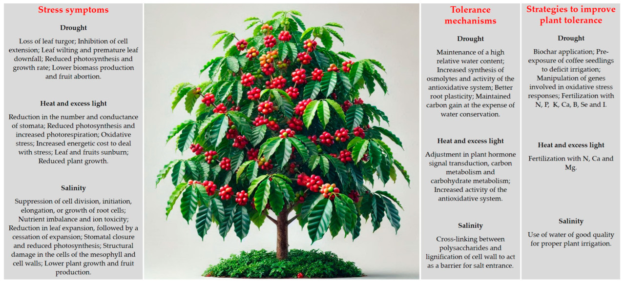 Абиотические стрессы серьезно нарушают физиологию растений на молекулярном, биохимическом и морфологическом уровнях, часто вызывая необратимые повреждения. Для обеспечения устойчивого производства кофе крайне важно понять, как такие неблагоприятные факторы окружающей среды, как засуха, жара, избыточное освещение и засоление, влияют на рост растений, и разработать стратегии для смягчения их последствий.