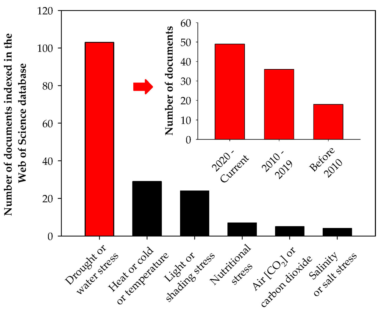 Большинство исследований по абиотическому стрессу у кофе сосредоточено на стрессе от засухи и было опубликовано за последние 15 лет (Рисунок 3). Засуха считается наиболее стрессовым фактором окружающей среды, влияющим на рост и урожайность растений, и ожидается, что ее негативные последствия станут еще более заметными из-за изменения климата [2,14]. В этом сценарии поддержание роста и урожайности сельскохозяйственных культур в одних из самых стрессовых условий, таких как водный дефицит, представляет собой одну из основных проблем современного сельского хозяйства [15].