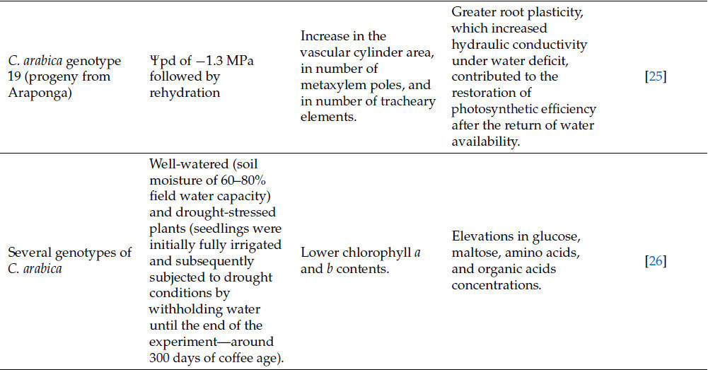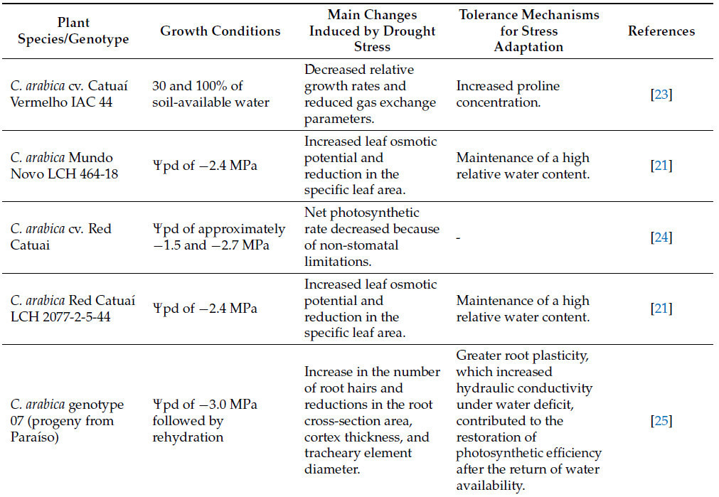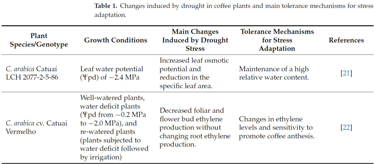 Таблица 1. Изменения, индуцированные засухой у кофейных растений, и основные механизмы толерантности для адаптации к стрессу.