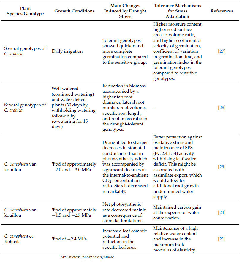 Основываясь на приведенных данных, наши цели в этом кратком обзоре заключались в том, чтобы (i) обобщить основные результаты, касающиеся воздействия засухи, жары, избыточного освещения и засоления на производство кофе и основных механизмов, используемых растениями для противодействия неблагоприятным факторам окружающей среды; и (ii) рассмотреть селекцию и питание растений в качестве стратегий для смягчения абиотического стресса в кофейных насаждениях.