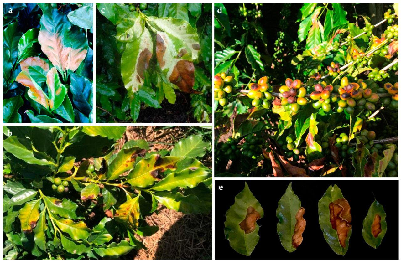 Рисунок 5. Начальные симптомы солнечного ожога на листьях и плодах кофе проявляются как бледные, обесцвеченные или выцветшие участки, которые становятся коричневыми (a,c) и некротическими (b,d,e).